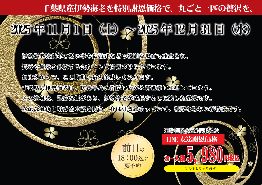 旬を迎える千葉県産伊勢海老を、丸ごと楽しむお料理です。数量限定に付きご予約はお早めに。
